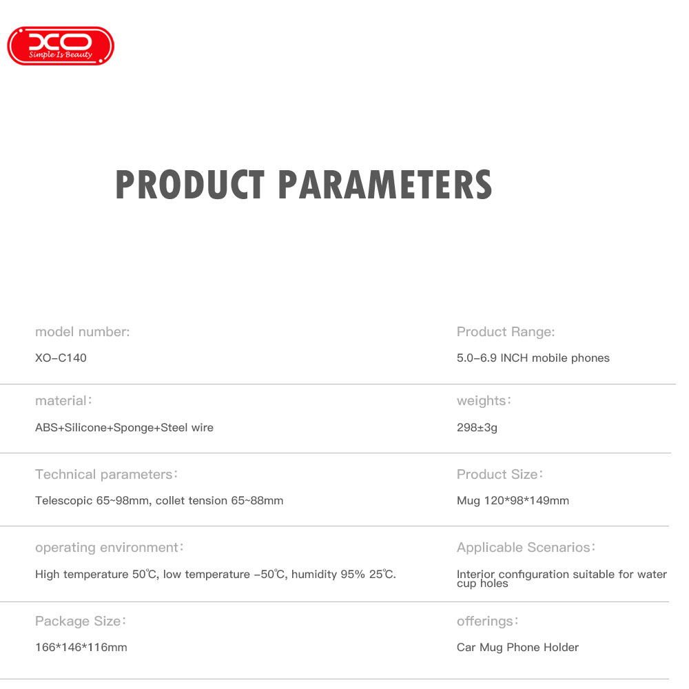 قسمت نگهدارنده موبایل هولدر C140 برند XO به صورت کشویی طراحی شده که به واسطه مکانیزم قرار گیری شاخص خود مانع دید راننده نمی شود. این هولدر نصب راحتی داشته و فقط با کمک یک دست می توانید گوشی خود را در آن قرار دهید.این بازوها با داشتن حالت انعطاف پذیری فوق العاده و قابلیت تنظیم زاویه 360 درجه برای گیره و بدون محدودیت پایه سیمی فولادی را دارد و با انواع برندهای گوشی در سایز 5.0 تا 6.9 اینچ مناسب بوده و هر مدل گوشی را در خود جای می دهند.