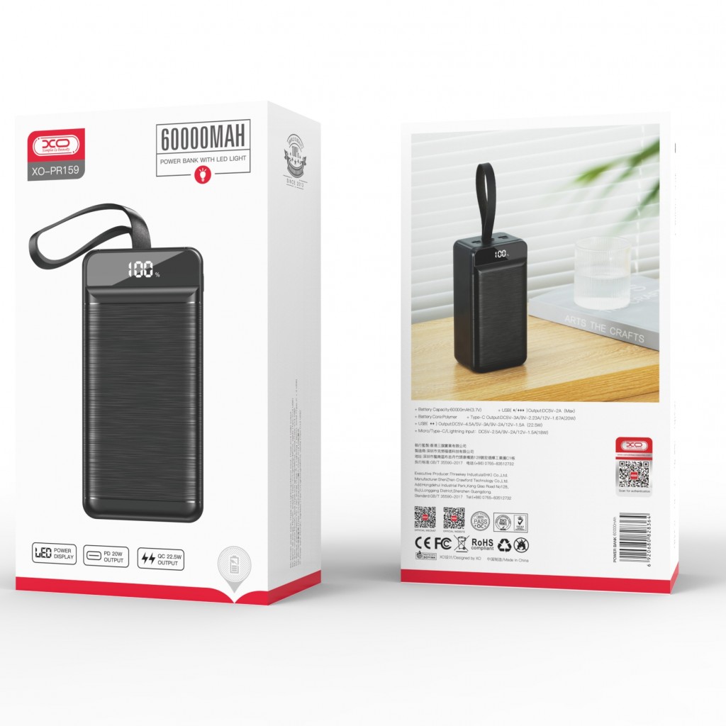 پاوربانک ایکس او مدل XO-PR159 با باتری از نوع پلیمری، ظرفیت اسمی 60000 میلی آمپر ساعت در رنگ مشکی با ابعاد 62×82.5×168 میلیمتر و وزن 1399 گرم با شارژ 4 دستگاه بصورت همزمان، قابلیت شارژ سریع تا توان 22.5 وات و دارای ایمنی بالا طراحی و تولید کرده است. این سری از پاوربانک های ایکس او در کلاس وزنی نیمه سنگین پاوربانک ها قرار گرفته و ساختاری از جنس ABS و پلی کربنات نسوز، از واردشدن ضربات به بدنه پاوربانک جلوگیری به عمل میآورد. پورت های ورودی و خروجی آن در قسمت جلویی آن جایگذاری شده و برای نمایش درصد باتری بر روی این پاوربانک از نمایشگر دیجیتالی با کیفیت بهره گرفته شده است.
