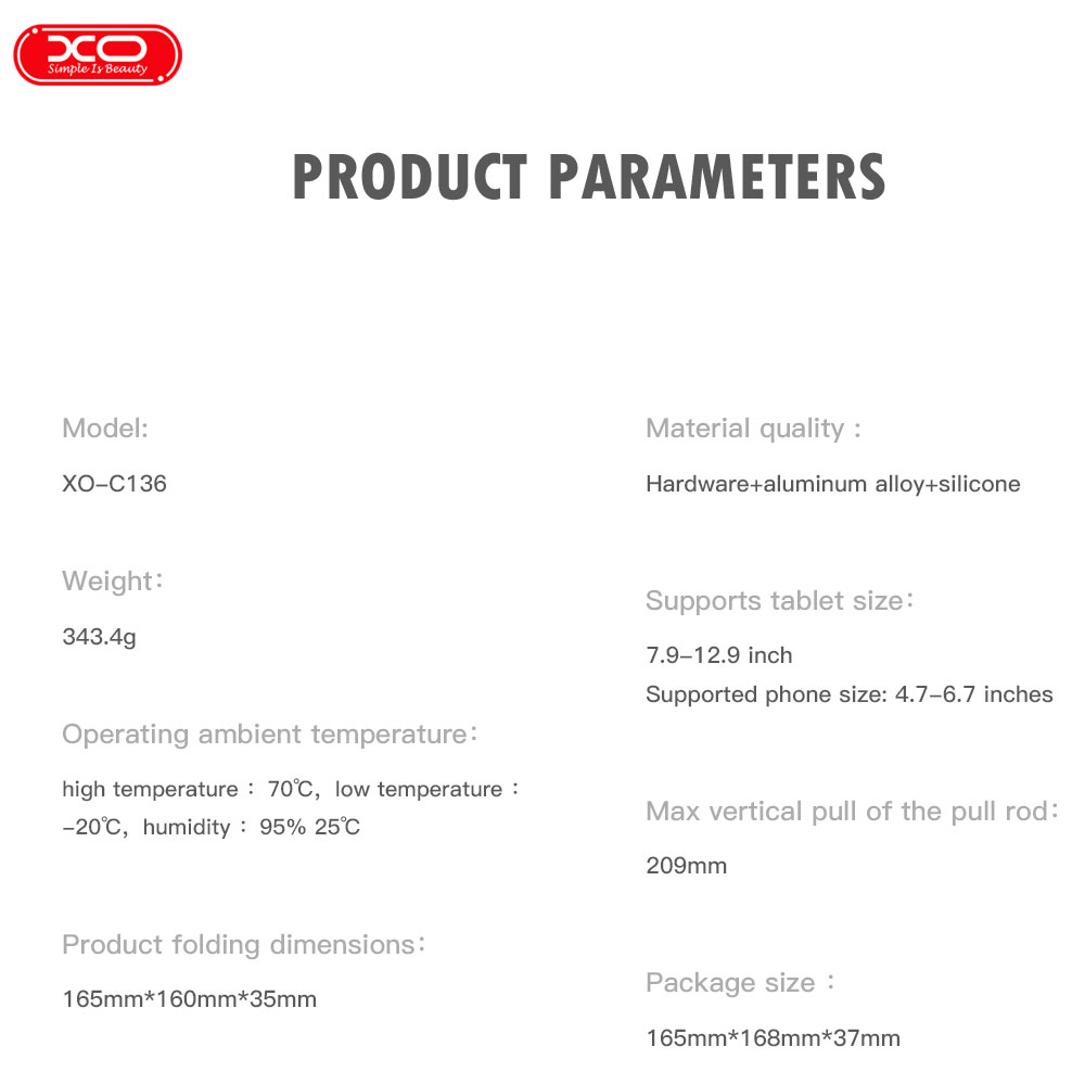 پایه نگهدارنده رومیزی ایکس او C136 به راحتی تاشو و بسیار قابل حمل است، ایدهآل برای سفر و یا استفاده در خارج از خانه است. شما از این هولدر میتوانید در خانه و هم محل کار برای تایپ کردن، وبگردی، کلاسهای آنلاین و برنامههای پخش زنده، برای تماشای فیلم، طراحی و نقاشی، مرور فایل، مشاهده عکس، خواندن، بازی کردن، مکالمه و تماس تصویری و غیره استفاده نمایید. هولدر موبایل ایکس او زمانی که در شیب 6 درجه قرار دارد و به سمت بالا کشیده میشود تا 800 گرم وزن را تحمل میکند و حداکثر کشش عمودی هولدر تا 209 میلی متر است. مناسب برای اکثر تبلتها، مک بوکها، تبلتها و نوتبوکهای سنگین وزن موجود در بازار از سایز 7.9-12.9 اینچ و گوشی های موبایل تا سایز 4.7-6.7 اینچ است.