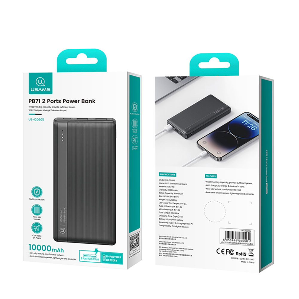 پاوربانک یوسمز مدل US-CD205 با کد فنی PB71 ساخته شده از مواد بسیار مرغوب پلاستیک ABS تا ساختاری مقاوم در برابر آسیب و حرارت داشته، بافت بسیار خوبی دارد و لک و اثر انگشتی روی آن باقی نمیماند. دارای باتری لیتیوم پلیمری با ظرفیت 10000 و توان کلی 10 وات میباشد. این پاور بانک یوسامز 4 پورت دارد که 2 تا از آن ها USB و یک عدد MicroUSB ورودی و دیگری که پورت تایپ C که هم پورت خروجی و هم پورت ورودی برای شارژ خود پاوربانک می باشد.
