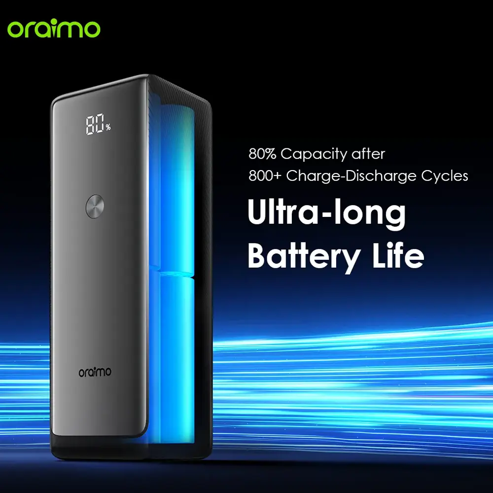 فناوری شارژ سریع ۱۳۰ وات نه تنها سرعت شارژ خروجی را بالا میبرد، بلکه به طور قابل توجهی زمان شارژ مجدد خود پاوربانک را کاهش میدهد. این شارژر همراه اورایمو مجهز به پورت ورودی Type-C با توان ۱۰۰ وات است که باعث میشود خود دستگاه در حدود تنها ۱.۵ ساعت به طور کامل شارژ شود؛ این ویژگی برای مواقعی که زمان کمی برای آمادهسازی تجهیزات خود دارید، حیاتی است. سیستم سهگانه خروجی شامل دو پورت USB-C و یک پورت USB-A، امکان شارژ همزمان سه دستگاه را فراهم میکند؛ پورت Type-C اصلی توان ۱۰۰ وات و پورت USB-A توان 24 وات را به صورت مجزا پشتیبانی میکند. کاربران فنی با این قابلیت میتوانند همزمان لپتاپ، تبلت و گوشی خود را به سرعت شارژ کنند.
