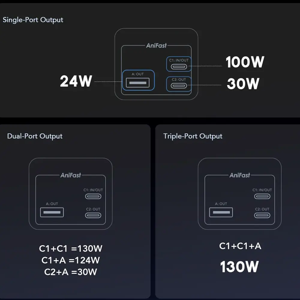 | ولتاژ خروجی | خروجی تایپ سی یک: 5V/3A - 9V/3A - 12V/3A - 15V/3A - 20V/5A نهایتا 100 واتخروجی تایپ سی دو: 5V/3A - 9V/3A - 12V/2.5A - 15V/2A نهایتا 30 واتخروجی یو اس بی: 5V/3A ;5V/4.5A; 4.5V/5A; 9V/2.5A; 12V/2A نهایتا 24 وات |
