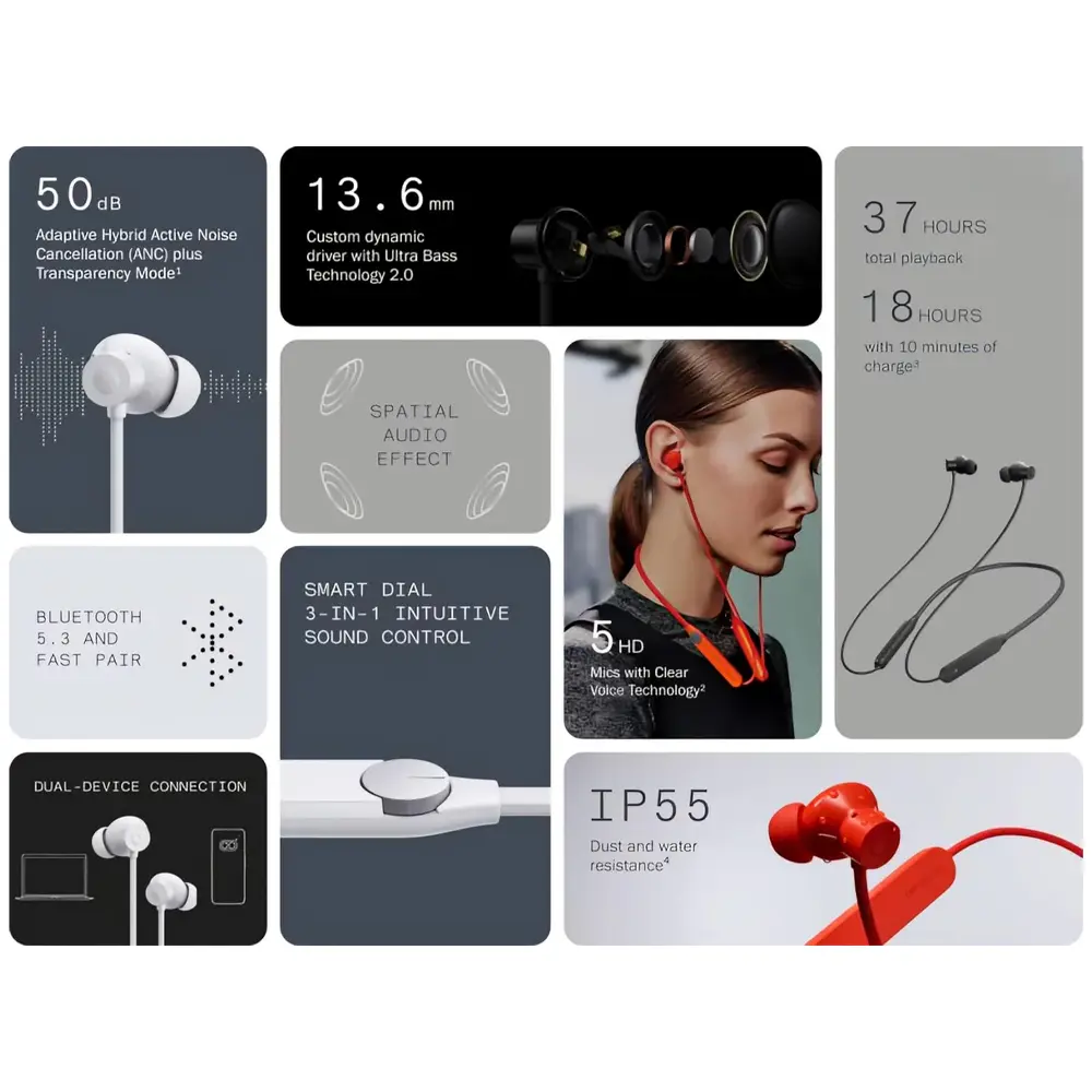 طراحی دورگردنی (Neckband) و وزن سبک ۲۹.۶ گرم، تضمینکننده طراحی ارگونومیک و پایداری کامل است. پاسخ به سؤال: آیا برای ورزش مناسب است؟ بله. این هدفون دارای گواهی IP55 است که آن را در برابر تعریق شدید و پاشش آب کاملاً مقاوم میسازد. علاوه بر این، ویژگی نوآورانه Smart Dial (دکمه گردان هوشمند) به کاربر اجازه میدهد که بهراحتی و بهصورت فیزیکی میزان صدا، ANC و سایر تنظیمات را کنترل کند. اتصال پایدار از طریق بلوتوث ۵.۳ و پشتیبانی از Dual Device Connection برای اتصال همزمان به دو دستگاه، تکمیلکننده مجموعه ویژگیهای فنی این محصول است.