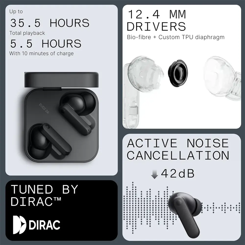 | عمر باتری در حالت پخش موسیقی | ANC خاموش: با کیس 35.5 ساعت و فقط بادزها ۸ ساعت,ANC روشن: با کیس 23 ساعت و فقط بادزها 5 ساعت |