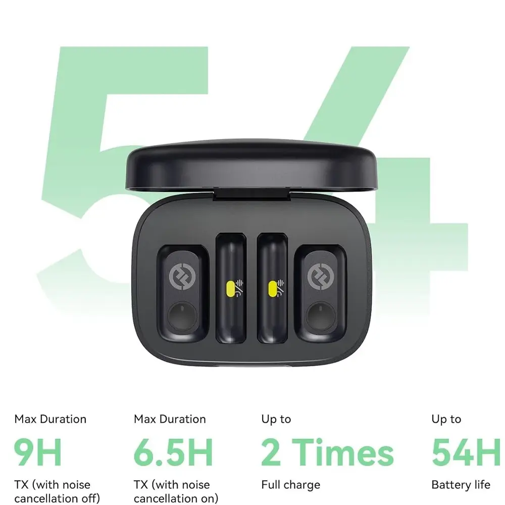 برای کاربرانی که آیا این میکروفون برای ضبطهای طولانیمدت مناسب است؟ سوال دارند، LARK A1 پاسخی قدرتمند دارد. با عمر باتری حدود ۹ ساعت برای هر فرستنده (TX) در حالت عادی و ۶.۵ ساعت در حالت فعال بودن حذف نویز، و با احتساب کیس شارژ ۴۶۰ میلیآمپر ساعتی که قابلیت ۲ بار شارژ کامل هر دو فرستنده را فراهم میکند، مجموعاً تا ۵۴ ساعت عملکرد متناوب در اختیار خواهید داشت. این ظرفیت فوقالعاده، اضطراب باتری را کاملاً از بین میبرد. در بحث اتصال، برد ۲۰۰ متری (۶۵۰ فوت) در خط دید مستقیم با استفاده از فناوری انتقال ۲.۴ گیگاهرتزی با پرش فرکانسی تطبیقی (AFH)، پایداری سیگنال را در بزرگترین فضاها تضمین کرده و اختلالات سیگنالی (Dropouts) را به حداقل میرساند.