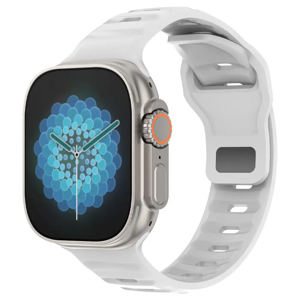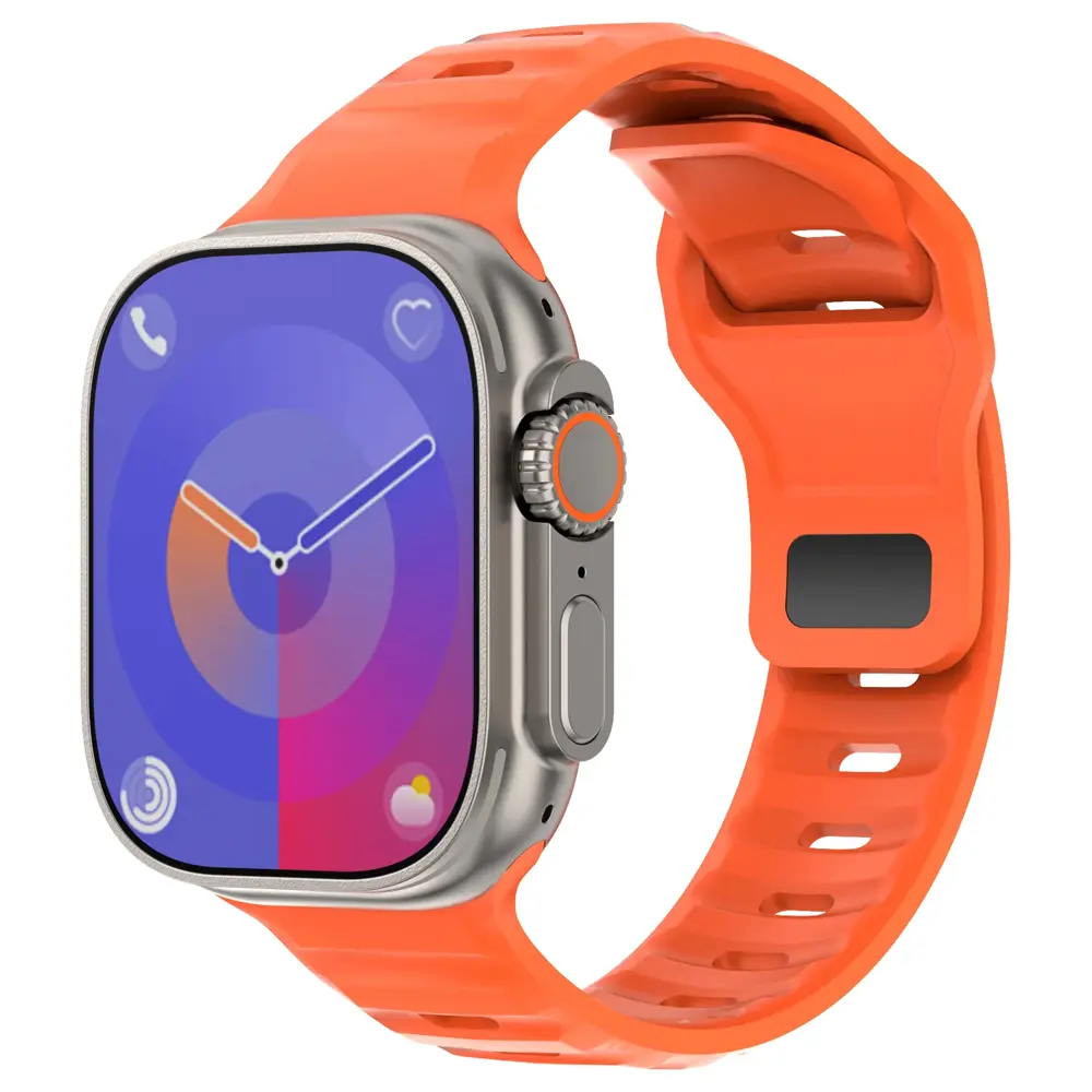 این ساعت با سایز فیزیکی 49 میلیمتری خود، ظاهری قدرتمند و اسپرت دارد که دقیقاً مطابق با استانداردهای طراحی مدلهای "اولترا" در بازار است. این ابعاد بزرگ، فضای لازم برای جایگذاری یک صفحه نمایش بینظیر 2.06 اینچی AMOLED HD را فراهم کرده است. رزولوشن 410×502 این نمایشگر تضمین میکند که تمام جزئیات محتوا، نقشهها و نوتیفیکیشنها با وضوح و روشنایی عالی مشاهده شوند. طراحی ارگونومیک بدنه 49 میلیمتری، در کنار بند سیلیکونی 22 میلیمتری، برای مچهای بزرگ و استفادههای سنگین ورزشی بسیار مناسب است.