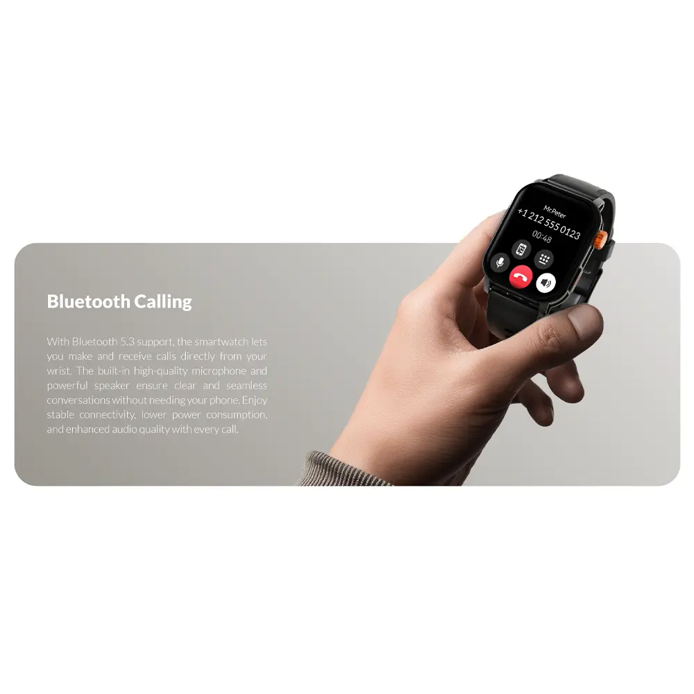 Glorimi Line با پشتیبانی از بلوتوث ۵.۳، اتصالی سریع، پایدار و کممصرف را برای مکالمات صوتی فراهم میکند. وجود میکروفون و اسپیکر داخلی، مکالمه را مستقیماً از روی ساعت ممکن میسازد. از لحاظ ذخیرهسازی، این ساعت هوشمند دارای ۱ گیگابایت حافظه داخلی (1Gb Internal Storage) است: