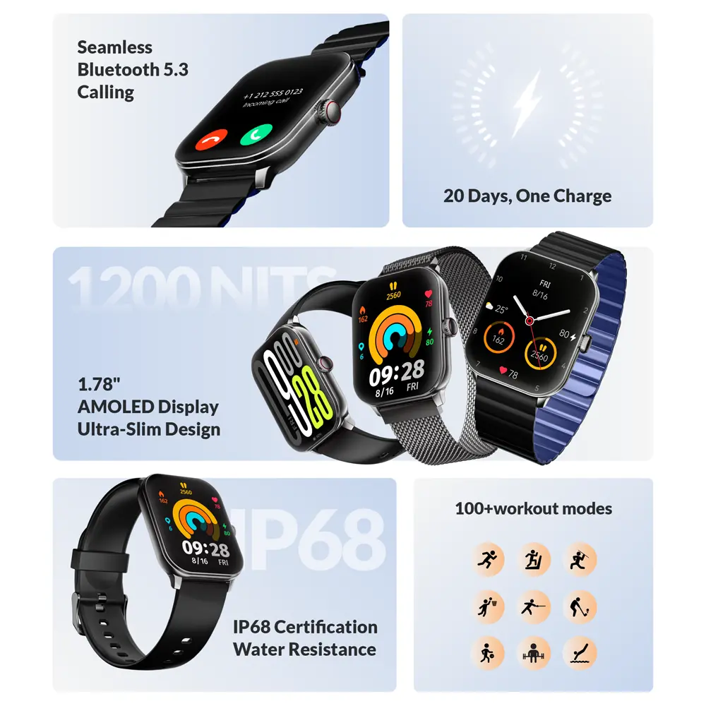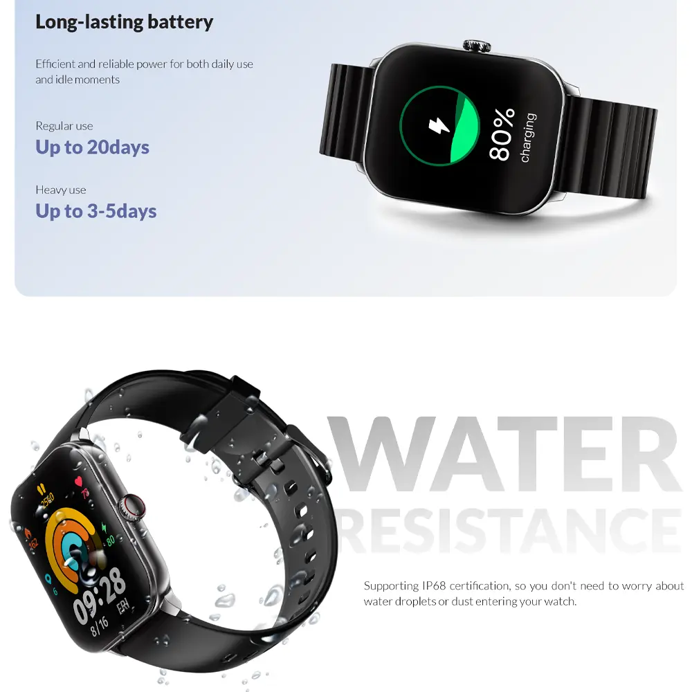 در بخش ارتباطات، وجود میکروفون و اسپیکر داخلی در کنار بلوتوث تماس ۵.۳ (Bluetooth Call 5.3)، امکان برقراری و دریافت تماسها را با کیفیت بالا مستقیماً از روی ساعت فراهم میکند. ویژگیهای نرمافزاری متنوعی مانند پاسخ سریع به پیامها (Message Quick Reply)، دستیار صوتی هوش مصنوعی (AI Voice Assistant)، مرورگر تقسیم صفحه (Split Screen Browser) و تایمر پومودورو (Pomodoro Timer)، عملکرد دستگاه را برای کاربران حرفهای و پرمشغله تسهیل میکنند.