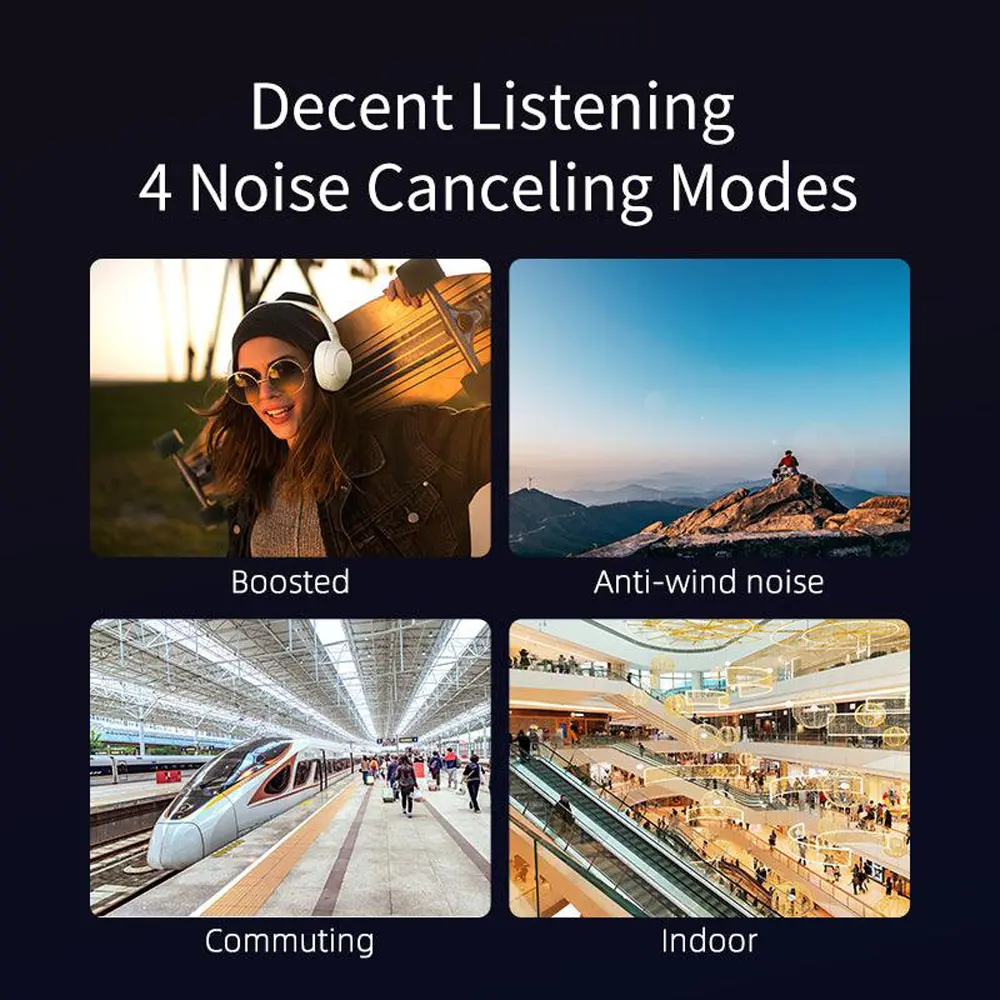سیستم نویز کنسلینگ در QCY H3 فراتر از انتظار عمل میکند. این هدفون مجهز به ANC هیبریدی است که عمق حذف نویز را تا بالا میبرد. این سیستم با ارائه چهار نوع حالت نویز کنسلینگ، به کاربر اجازه میدهد تا میزان حذف نویز را بر اساس نوع محیط خود تنظیم کند؛ این قابلیت شخصیسازی، تجربه کاربری را بهبود میبخشد. همچنین، ویژگی ANC تطبیقی (Adaptive ANC) به صورت خودکار سطح حذف نویز را با تغییرات محیط اطراف هماهنگ میکند. این هدفون حتی دارای قابلیت کاهش نویز باد (Wind Noise Reduction) است که برای استفاده در فضای باز یا حین ورزش (با توجه به وزن ) مناسب است.
