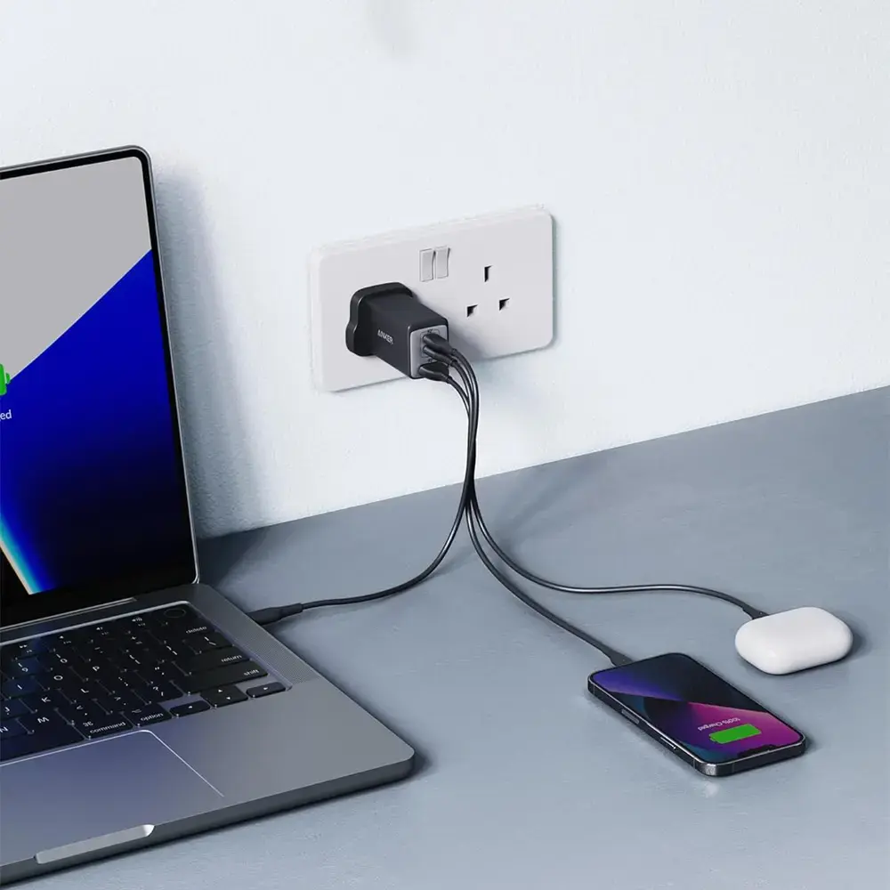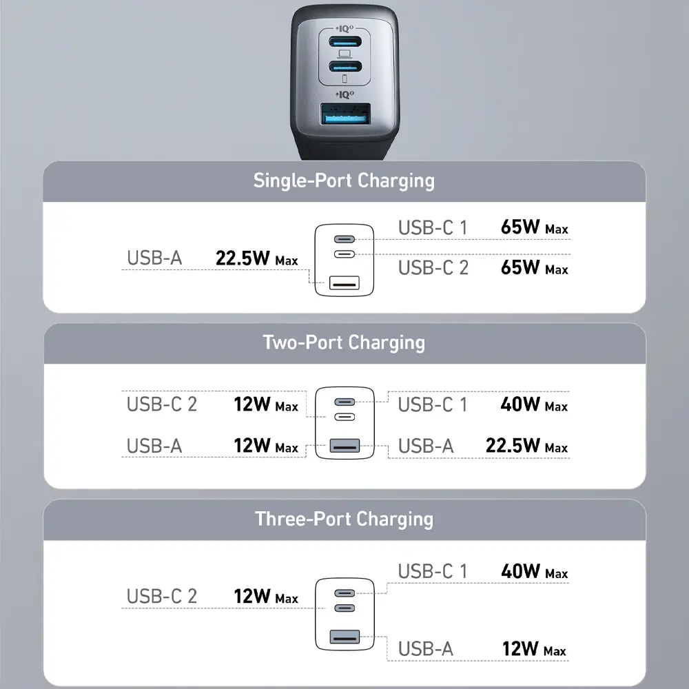 USB-C 1 (40W) + USB-C 2 (12W) + USB-A (12W)