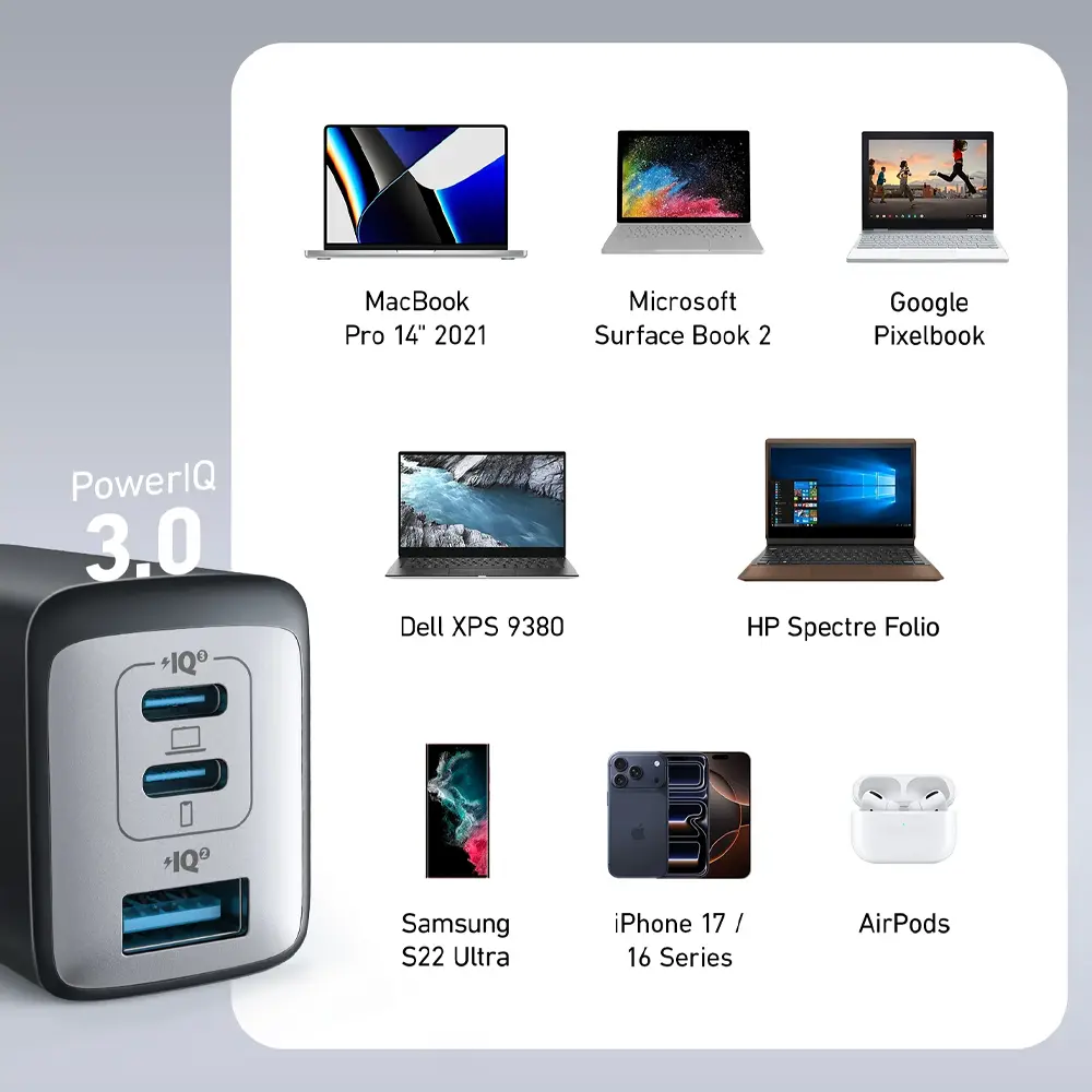 پورتهای USB-C این شارژر صرفاً برای موبایل طراحی نشدهاند؛ هر دو پورت تایپسی به تنهایی قادر به ارائه خروجی 65W هستند. این یعنی شما میتوانید لپتاپهای قدرتمندی نظیر مکبوک پرو ۱۳ اینچ، مکبوک ایر، Dell XPS 13 و ThinkPad X390 را با همان سرعت شارژر اصلی و در محیطی ایمن شارژ کنید. مهندسی دقیق انکر در مدل A2667 باعث شده تا افت ولتاژ در بارهای سنگین به حداقل برسد که این موضوع برای حفظ سلامت برد تغذیه لپتاپهای گرانقیمت حیاتی است. 💻