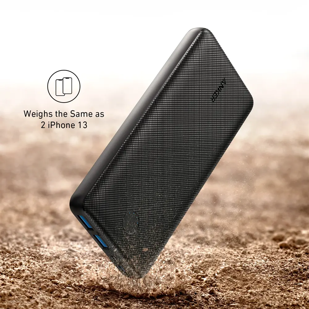 بدنه این پاوربانک با بافتی خاص طراحی شده که علاوه بر زیبایی، مقاومت بسیار بالایی در برابر خراشیدگی و ضربه دارد؛ موضوعی که برای طبیعتگردان و مسافران یک مزیت بزرگ محسوب میشود. از نظر درگاههای ورودی، انکر آزادی عمل بالایی به شما داده است؛ شما میتوانید از طریق هر دو درگاه Micro USB یا USB-C اقدام به شارژ مجدد پاوربانک کنید. لازم به ذکر است که درگاه USB-C در این مدل فقط به عنوان ورودی (Input) عمل میکند و برای شارژ گوشی نیست. ۴ نشانگر LED با رنگ آبی یخی نیز به دقت وضعیت باقیمانده انرژی را به شما نمایش میدهند. 🛡️