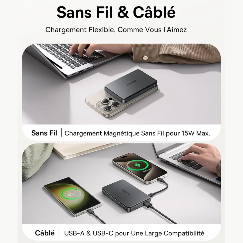 روی بدنه شارژر قابل حمل بیسوس علامت مگ سیف تعبیه شده که برای اتصال گوشیها به آن و شارژ بیسیم کاربرد دارد. در این قسمت از پاوربانک، آهنرباهای استفاده شده که فوق العاده قوی است و گوشی شما را محکم نگه می دارد. قابلیت شارژ وایرلس و بیسیم این امکان را فراهم کرده است که بدون نیاز به کابل شارژ، گوشی آیفون خود را شارژ کنید؛ بیآنکه کابل شارژ مزاحمتی برای شما ایجاد کند. حداکثر توان خروجی بیسیم 22.5 وات محاسبه شده و به کاربر امکان میدهد تا دستگاههایی که از این استاندارد پشتیبانی میکنند را به طور بیسیم و بدون نیاز به کابل شارژ کند. نکته مثبت دیگر در آن است که هنگام قرارگیری گوشی روی پد وایرلس این پاوربانک جیبی، دوربینهای گوشی پوشانده نشده و میتوانید بهراحتی ضمن شارژشدن گوشی، از آن استفاده آزادانهای داشته و به کار موردنظر خود همچون عکاسی یا تماشای فیلم و... بپردازید.