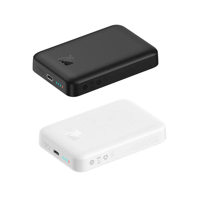 پاوربانک مگنتی بیسوس مدل PPCXM06A ظرفیت 6000 میلی آمپر ساعت توان 20 وات در دو رنگ مشکی با کد فنی P10059002113-00 و رنگ سفید با کد فنی P10059002223-00 در ابعاد 15×64×97 میلیمتر و وزن 140 گرم تولید شده با طراحی مدرن، قابلیتهای پیشرفته و ظرفیت بالا، یک انتخاب ایدهآل برای کاربران حرفهای است. این محصول با پشتیبانی از فناوری مگ سیف، خروجی 20 وات و قابلیت شارژ وایرلس 15 واتی، تمامی نیازهای شما را برای شارژ دستگاههای مختلف، در هر زمان و مکانی برآورده میکند. روی بدنه یک کلید پاور میبینید و چهار چراغ نشانگر؛ چراغها میزان باتری را نمایش میدهند و هر کدام از آنها نشاندهنده 25 درصد از شارژ باتری هستند.