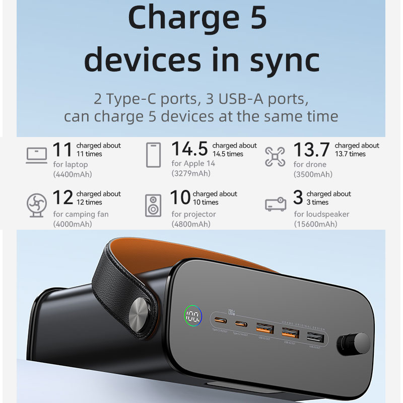 پورتهای این پاوربانک شامل 5 خروجی که 3 عدد USB و 2 عدد Type-C می باشد. با این غول شارژر همزمان میتوانید 5 دستگاه را از جمله تلفن همراه، تبلت، ایرپاد، دوربین و حتی لپ تاپ و یا هر دستگاه دیگری را شارژ کنید.