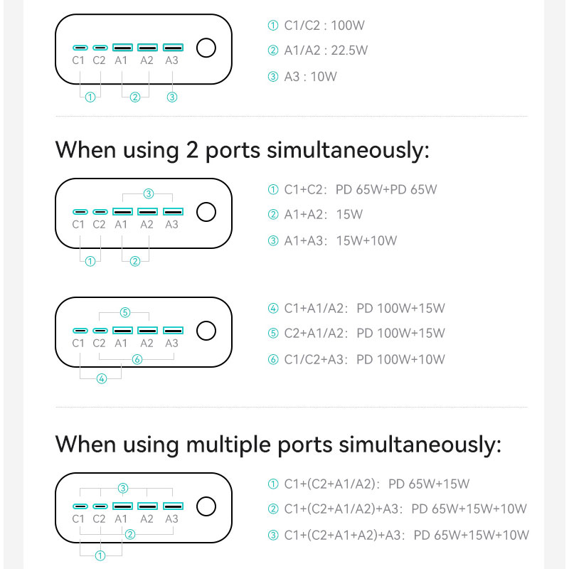 | ولتاژ خروجی | خروجی تایپ سی یک و دو: 5V/3A - 9V/3A - 12V/3A - 15V/3A - 20V/5A نهایتا 100 واتخروجی یو اس بی یک و دو: 4.5V/5A - 9V/2A - 12V/1.5 نهایتا 22.5 واتخروجی یو اس بی سه: 5V/2A نهایتا 10 واتخروجی همزمان تایپ سی یک و دو: PD65W+PD65W نهایتا 130 وات |