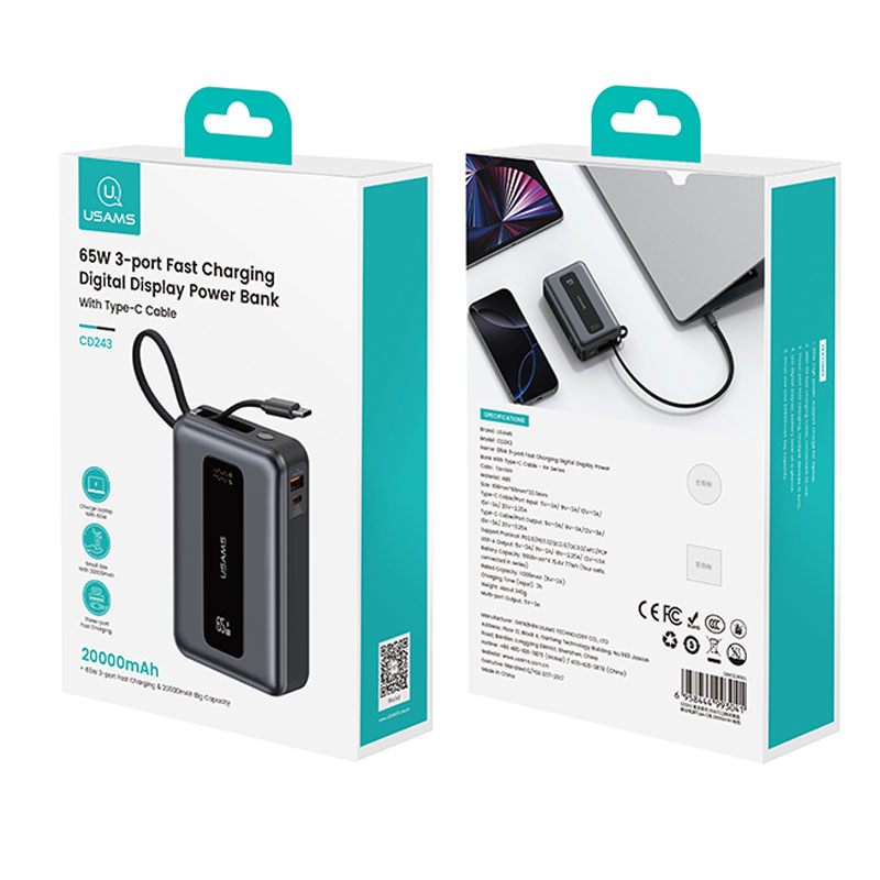 USAMS US-CD243 65W 3-port Power Bank With Type-C Cable